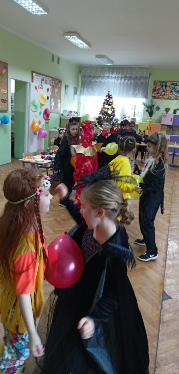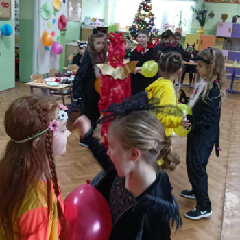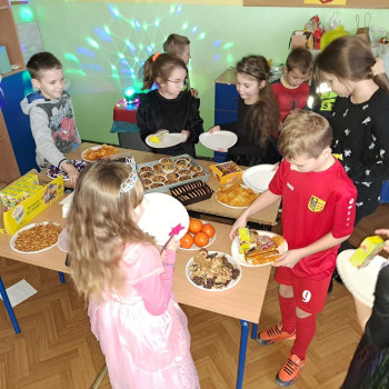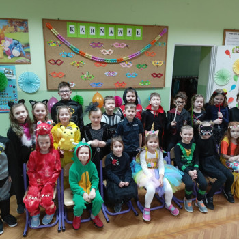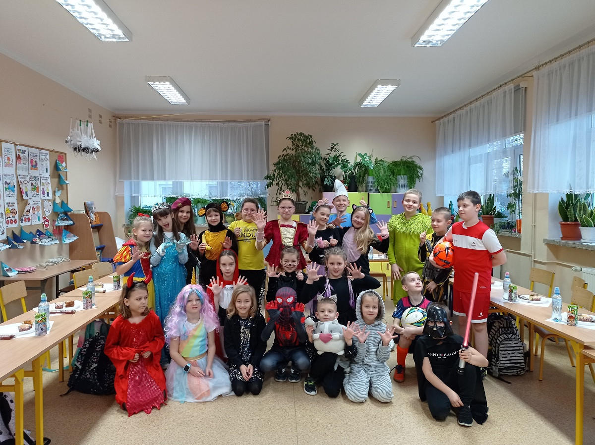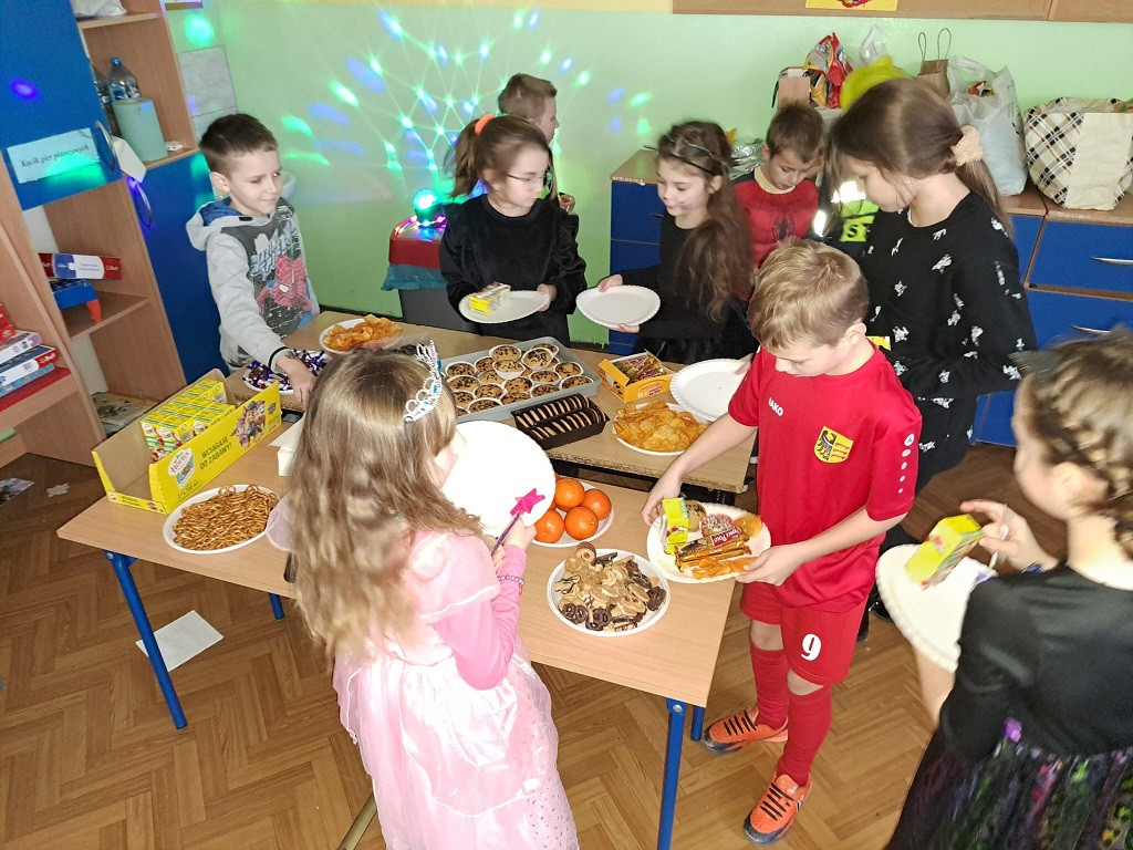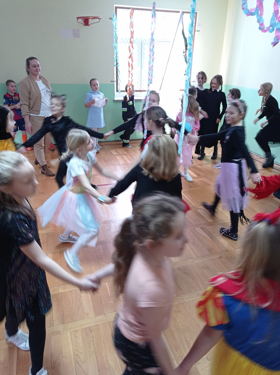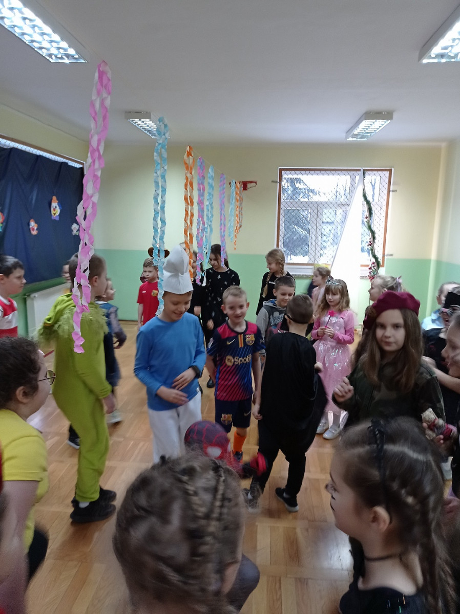 Młodsi uczniowie niecierpliwie oczekiwali dnia, w którym sala gimnastyczna i każda sala lekcyjna zamieniły się w sale balowe. Wcześniej aktywni i chętni uczniowie wraz z wychowawcami przygotowali elementy do ich dekoracji. Niecodzienny wygląd sali gimnastycznej wprowadził dzieci w wesoły nastrój i zachęcił do wspólnej zabawy. Dzieci bawiły się znakomicie. Prowadzący zabawę w klasach wychowawcy urozmaicali tańce konkursami, ciekawymi konkurencjami i pokazami. W klasach dzieci miały zorganizowany przez wychowawców przy zaangażowaniu rodziców poczęstunek. Była to również okazjado wykonania pamiątkowych zdjęć w karnawałowych przebraniach podczas zabawyz kolegami i koleżankami. Uczestnicy balu wcielili się w bohaterów znanych bajek i filmów albo w samych siebie.