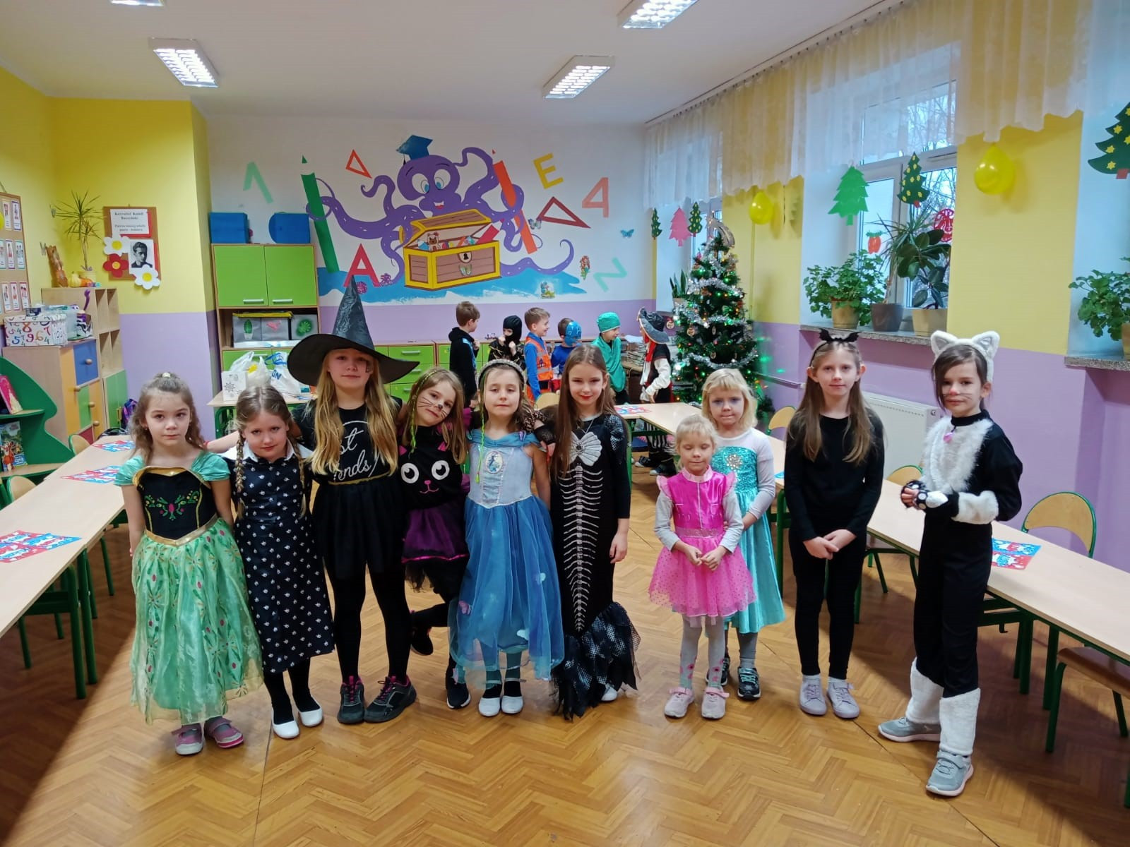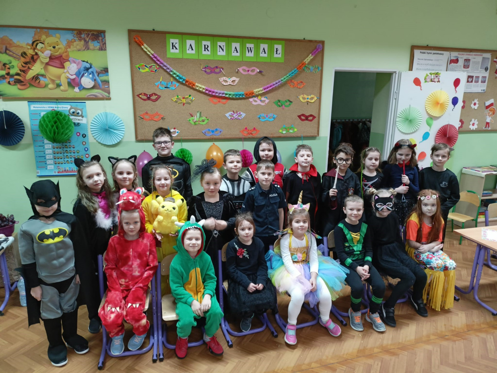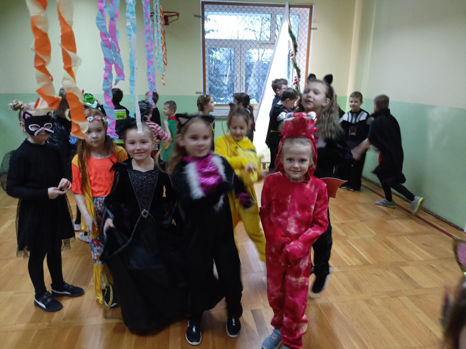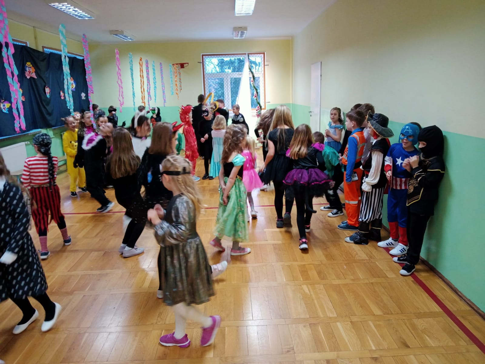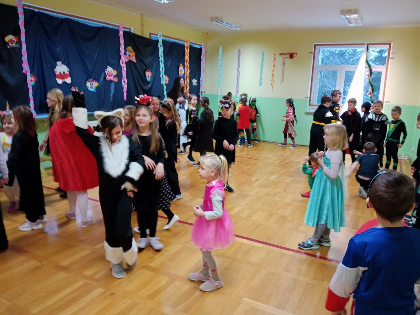 Młodsi uczniowie niecierpliwie oczekiwali dnia, w którym sala gimnastyczna i każda sala lekcyjna zamieniły się w sale balowe. Wcześniej aktywni i chętni uczniowie wraz z wychowawcami przygotowali elementy do ich dekoracji. Niecodzienny wygląd sali gimnastycznej wprowadził dzieci w wesoły nastrój i zachęcił do wspólnej zabawy. Dzieci bawiły się znakomicie. Prowadzący zabawę w klasach wychowawcy urozmaicali tańce konkursami, ciekawymi konkurencjami i pokazami. W klasach dzieci miały zorganizowany przez wychowawców przy zaangażowaniu rodziców poczęstunek. Była to również okazjado wykonania pamiątkowych zdjęć w karnawałowych przebraniach podczas zabawyz kolegami i koleżankami. Uczestnicy balu wcielili się w bohaterów znanych bajek i filmów albo w samych siebie.