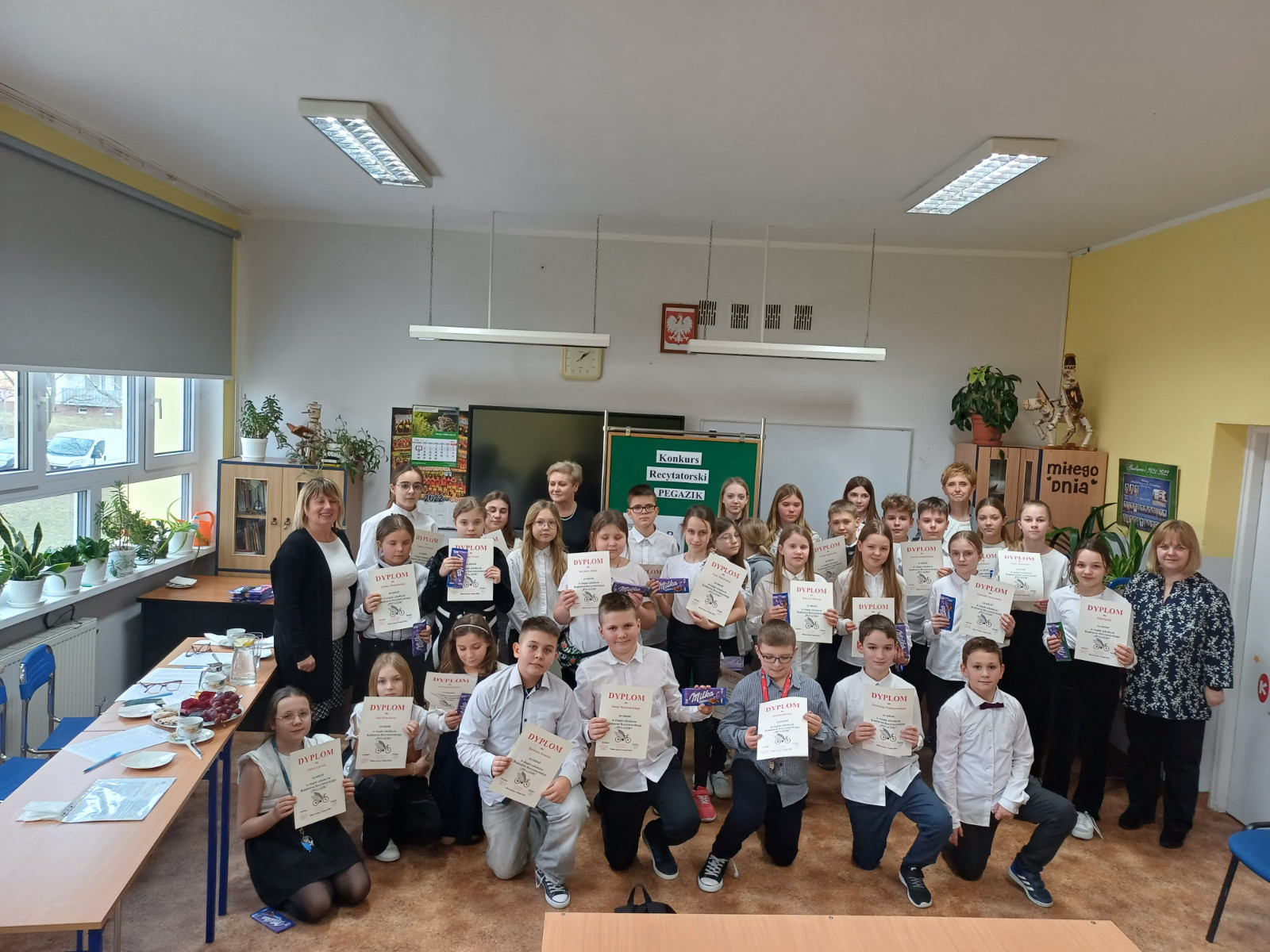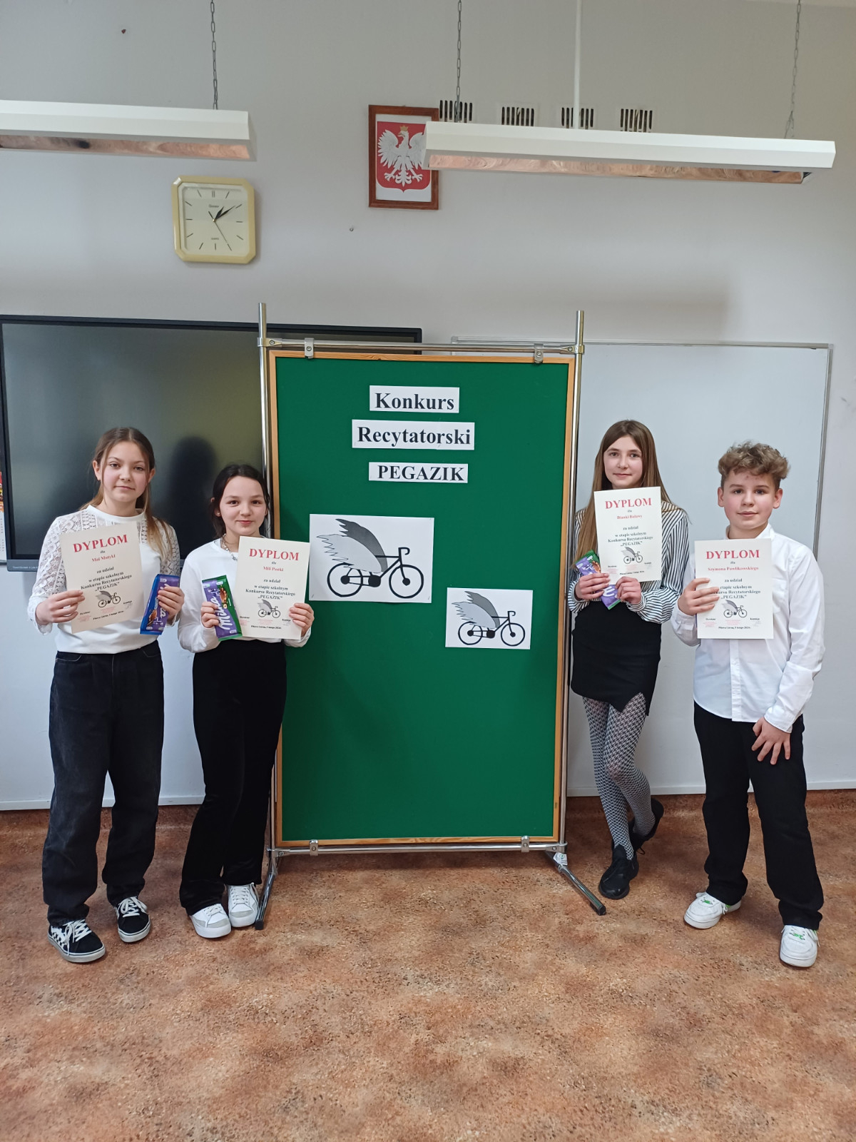 Dnia 5.02.2024r. w naszej szkole odbył się etap szkolny i gminny XXVII Dolnośląskiego Konkursu Recytatorskiego „Pegazik”. W kategorii młodsi wiersz lub fragment prozy recytowało 30 uczniów. Natomiast w kategorii starsi 11 uczestników wykonywało dwa utwory: wiersz i fragment prozy. Jury w składzie: Zastępca Burmistrza p. Marta Sochacka-Pelczar, Dyrektor Szkoły p. Danuta Zaręba i wicedyrektor p. Halina Pióra oceniało uczestników na podstawie kryteriów: dobór repertuaru (wartość artystyczna utworów oraz ich dobór do możliwości wykonawczych uczestnika), interpretacja utworów, kultura słowa i ogólny wyraz artystyczny.