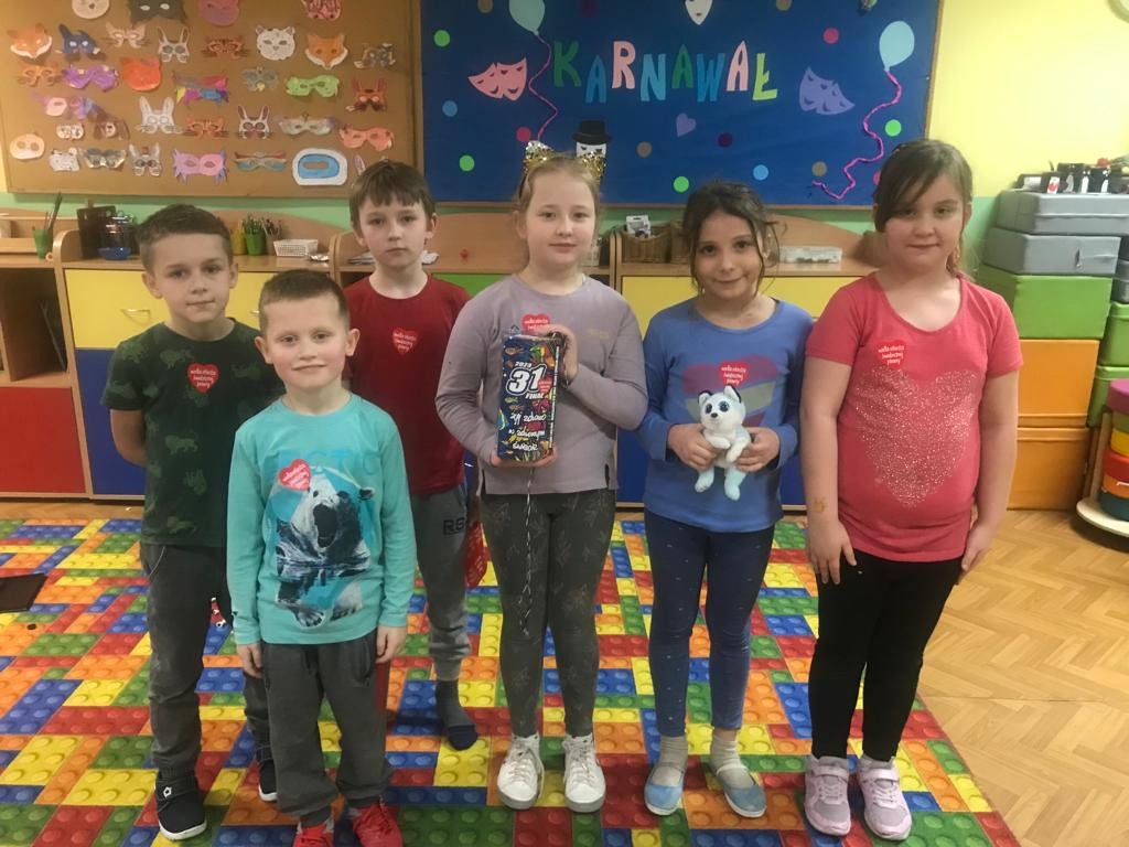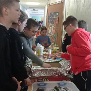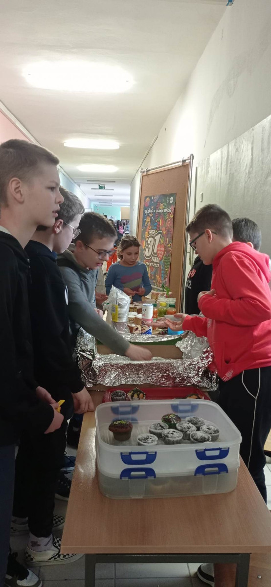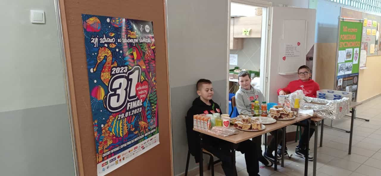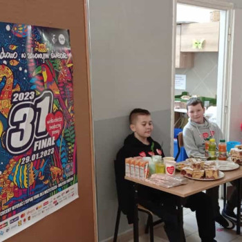 W tym roku po raz drugi w naszej szkole odbył się Mini Finał Wielkiej Orkiestry Świątecznej Pomocy. Akcja trwała przez cały tydzień od 23 do 27 stycznia. Zaangażowanie uczniów, rodziców, wychowawców i nauczycieli było przeogromne. Przez dwa pierwsze dni uczniowie klas 8 i 7 przygotowali „Mini kawiarenkę” w bibliotece szkolnej, w której można było zakupić różne słodkości i napoje. Natomiast na pierwszym piętrze pod czujnym okiem pani Ani Opieli wolontariusze ze Szkolnego Koła Wolontariatu „Krzyśki” sprzedawali gofry i tosty. Dużym powodzeniem wśród uczniów cieszyła się „zabawa z niespodzianką”. Każdy uczestnik mógł wylosować atrakcyjną nagrodę. W tych dniach gośćmi kawiarenki byli głównie uczniowie klas 1-3. W środę w sklepiku szóstoklasiści zaproponowali przepyszne ciasta, babeczki i inne smakołyki. Sprzedaż trwała przez wszystkie przerwy i lekcje. W czwartek klasy 5 proponowały różne słodkości: batoniki, galaretki, ciastka i babeczki. Piątoklasiści wykazali się wyjątkowymi zdolnościami w dziedzinie marketingu, proponując swój towar w konkurencyjnych cenach.
