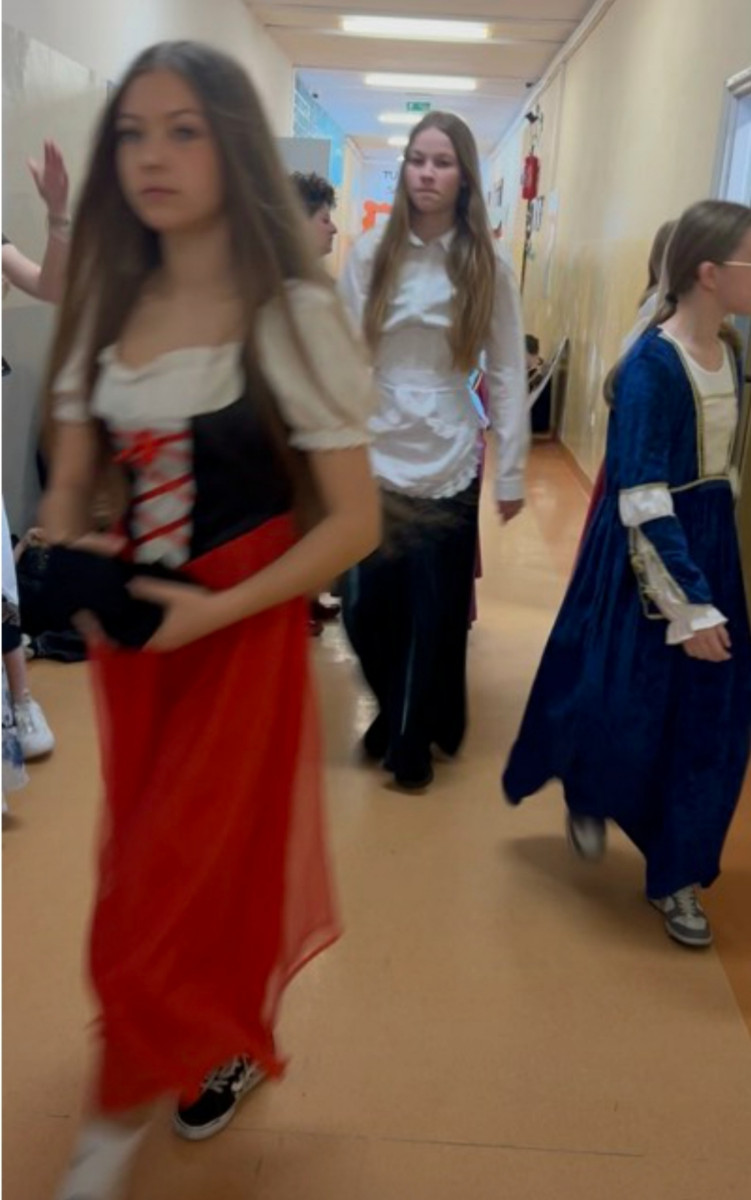 I Koordynatorzy oraz uczniowie pełniący funkcję projektantów, garderobianych oraz giermków przyodziewali uczniów biorących udział w filmie.