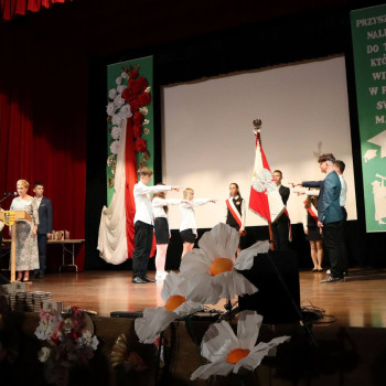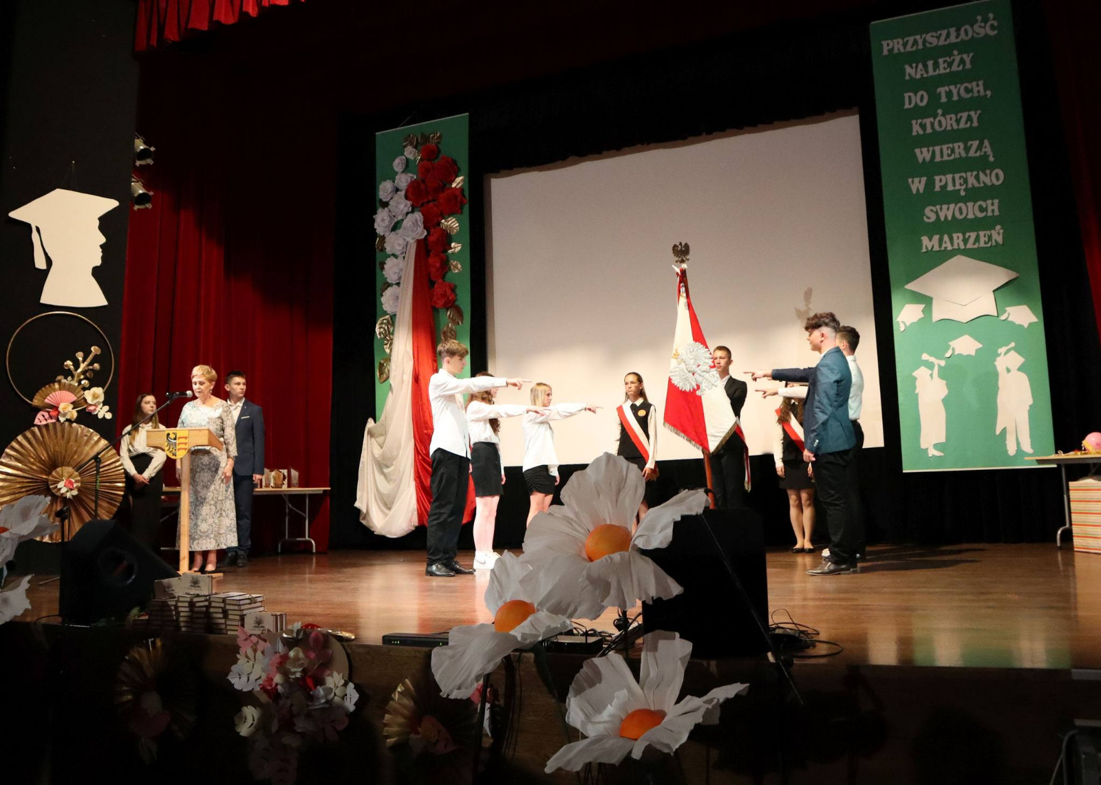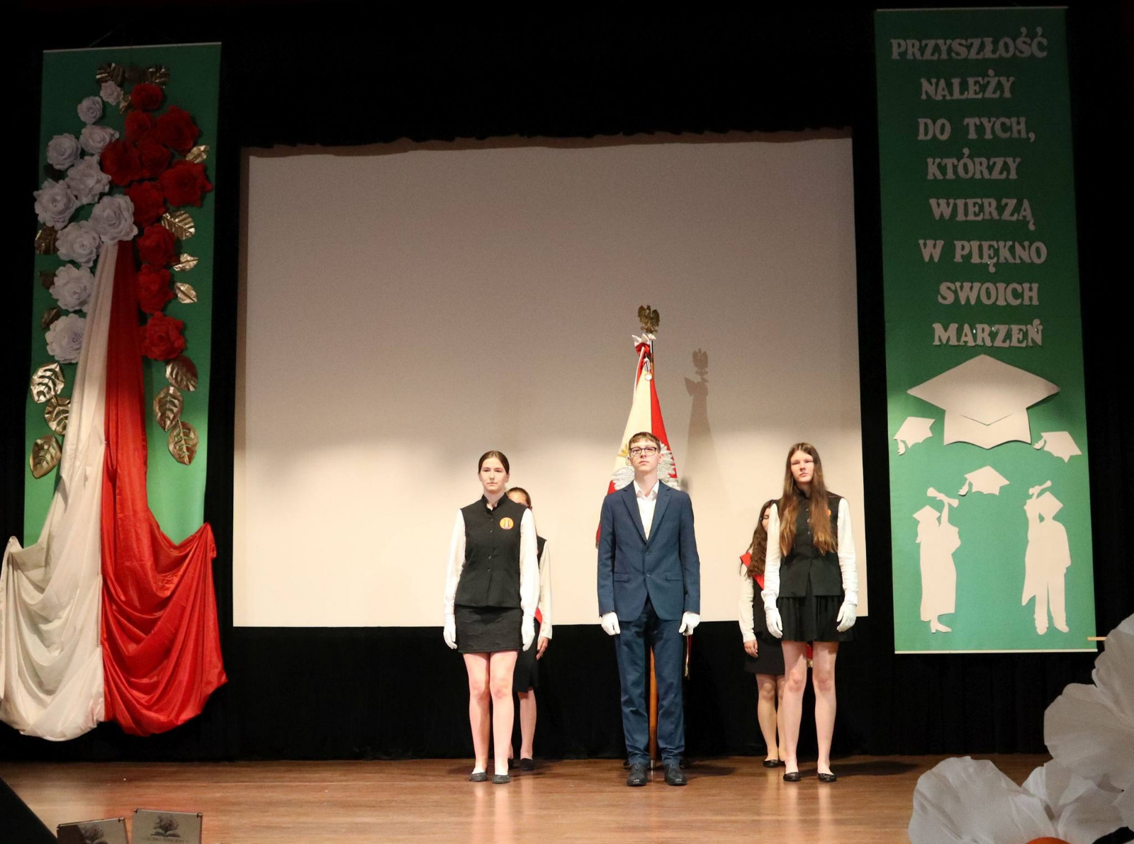 Następnie, zgodnie z tradycją szkoły, odbyło się Ślubowanie Absolwentów i przekazanie Sztandaru Szkoły z rąk odchodzącego pocztu sztandarowego nowej honorowej asyście sztandaru wyłonionej spośród uczniów klas siódmych. Był to bardzo podniosły moment, po którym nastąpiło wręczenie nagród, statuetek i podziękowań.