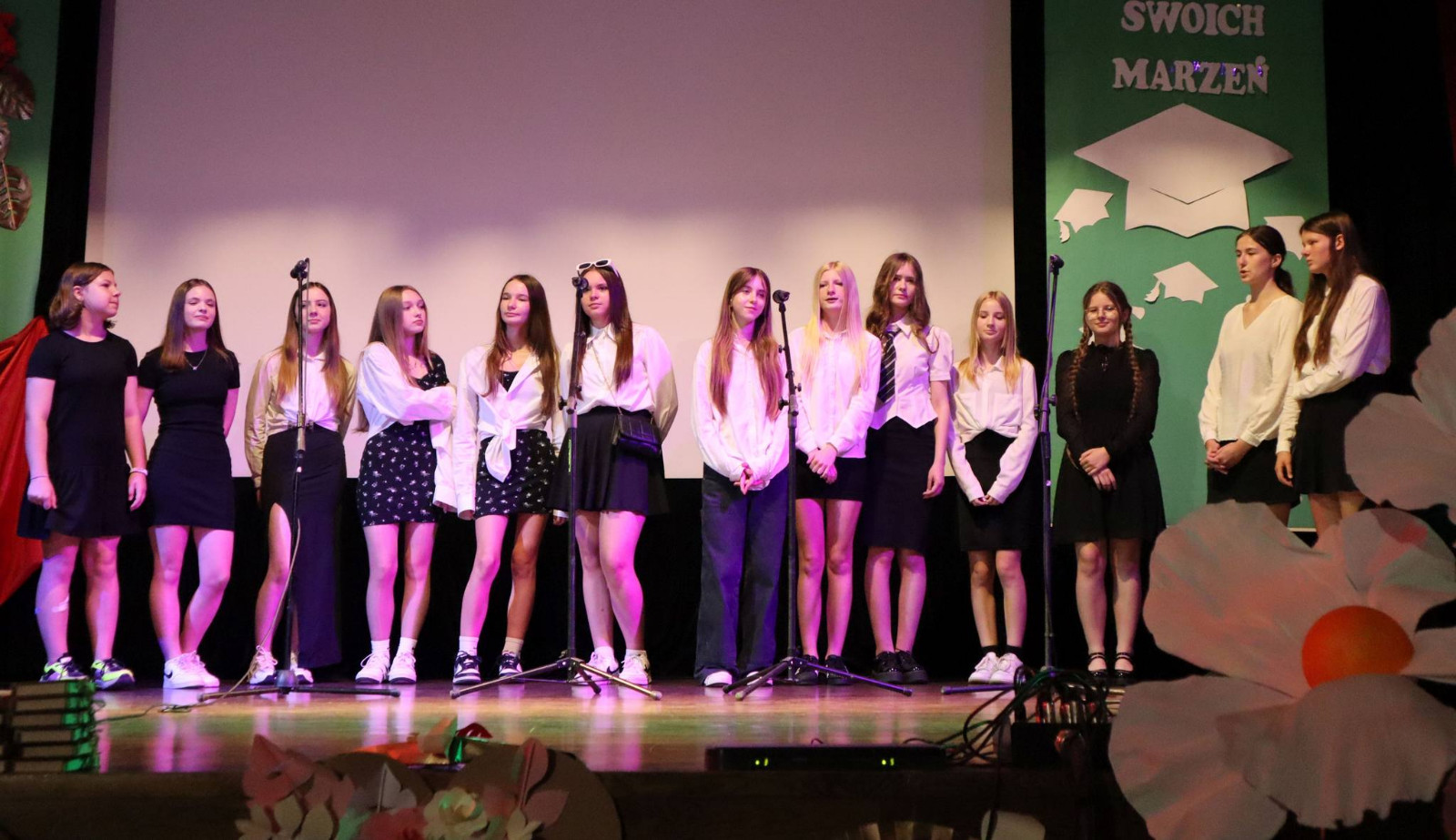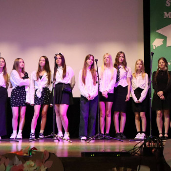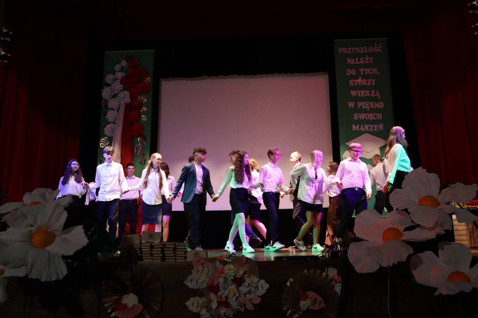 Część artystyczna rozpoczęła się polonezem w wykonaniu absolwentów, którzy również wierszem i słodkim upominkiem złożyli nauczycielom swoje podziękowania, a na ręce p. dyrektor przekazali pamiątkowe tablo. Z kolei uczniowie klas siódmych z pewną dozą humoru pożegnali ósmoklasistów, przyznając każdemu tytuł, nagrodę lub odznaczenie za zasługi, zarówno te znane szerszej publiczności, jak i te, na które nikt do dnia dzisiejszego nie zwrócił większej uwagi. Podarowali również absolwentom upominki.