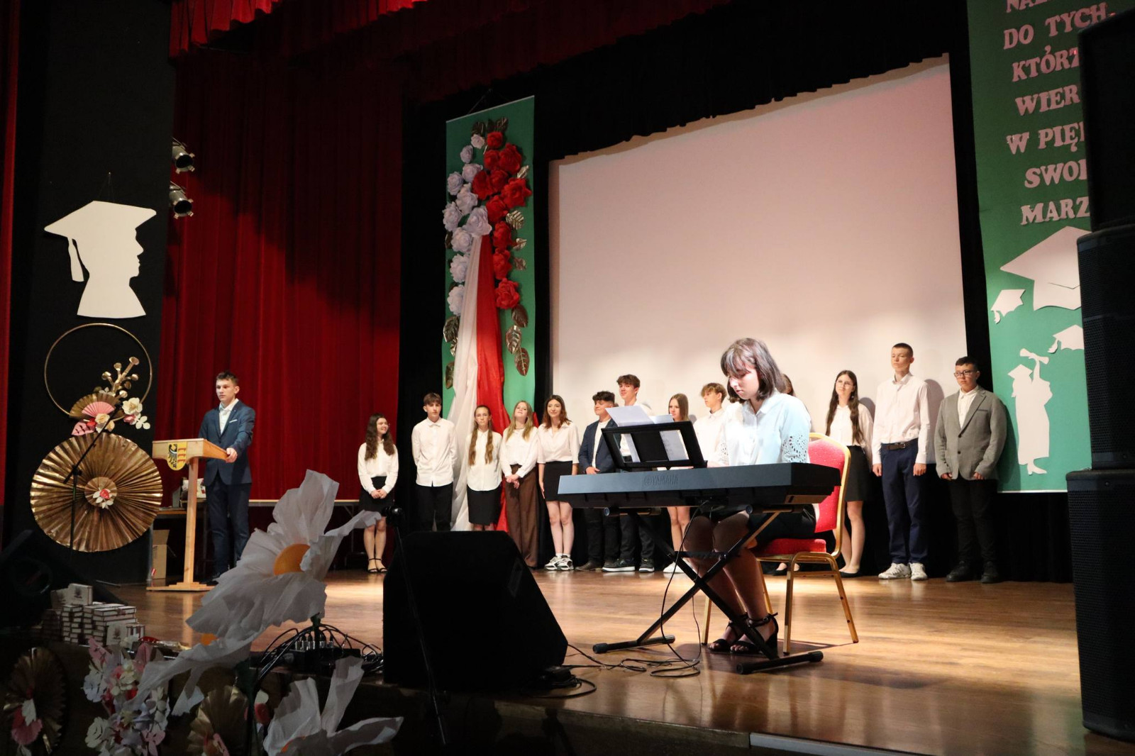 Uczniowie klasy ósmej oficjalnie pożegnali się z naszą szkołą 20 czerwca 2024r. podczas uroczystej akademii. Pani dyr. Danuta Zaręba serdecznie przywitała przybyłych na uroczystość gości: Burmistrza Piławy Górnej p.Krzysztofa Chudyka, Insp. ds. Oświaty p.Magdalenę Kochowską, dyrektora MOKiB p.Iwonę Szubę, dyrektora Przedszkola „Tęczowa Kraina” p.Barbarę Mazur, księdza proboszcza Krzysztofa Corę, nauczycieli, rodziców oraz ósmoklasistów. Szczególne słowa skierowała do absolwentów. Pogratulowała sukcesów, podziękowała za trud, wysiłek i zaangażowanie w zdobywaniu nowych umiejętności, w poznawaniu i rozwijaniu swoich zdolności i talentów. Życzyła pomyślnościw nowej szkole.