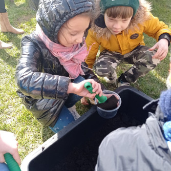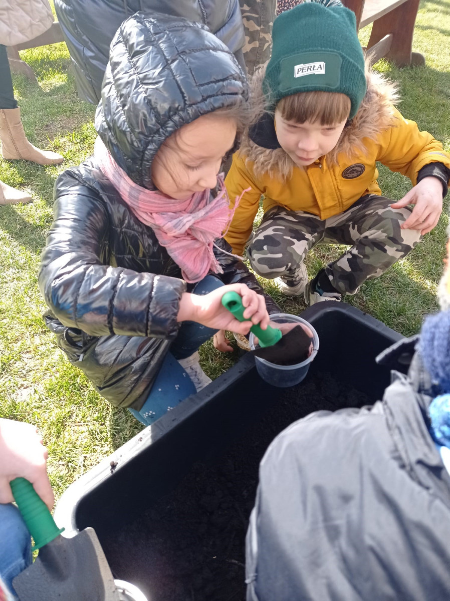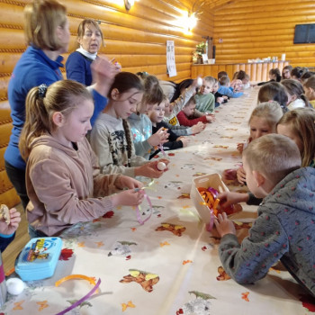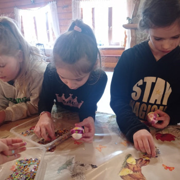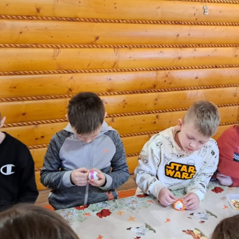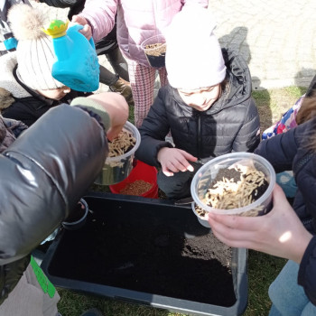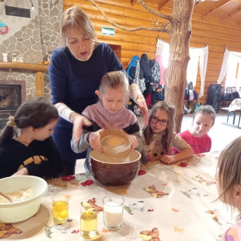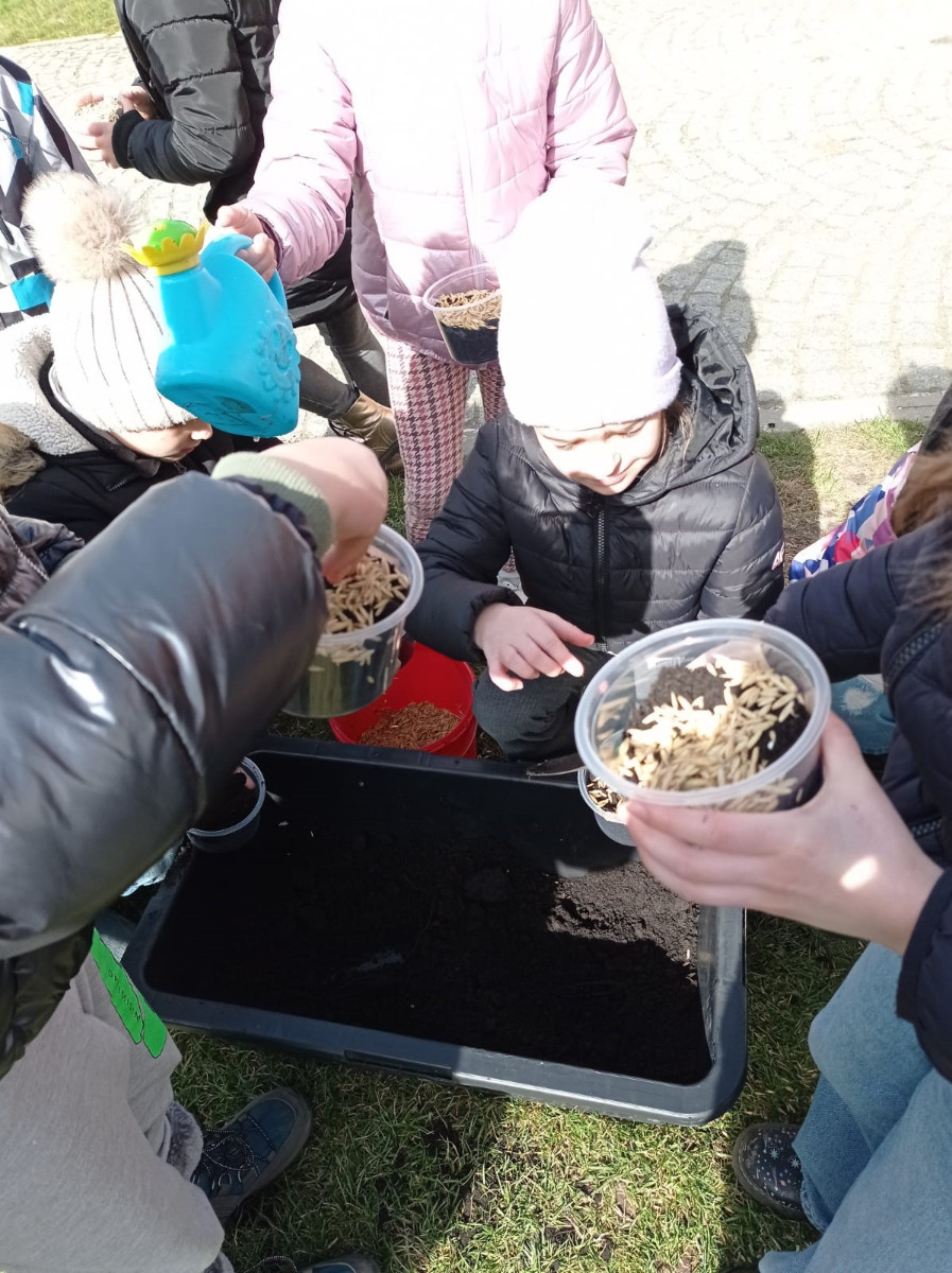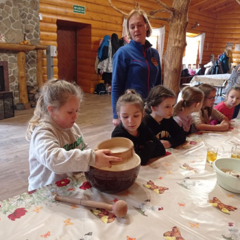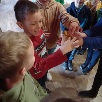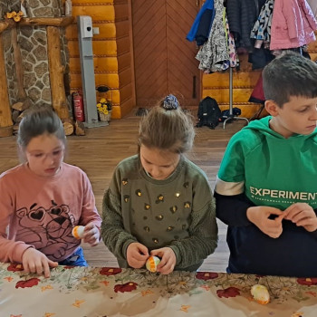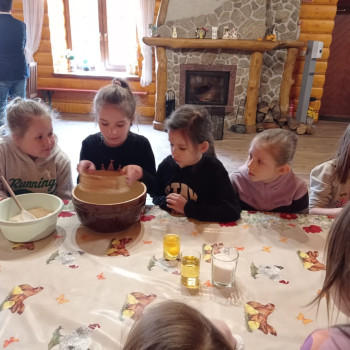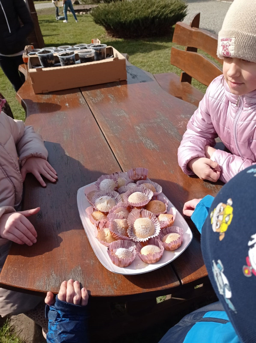 Uczniowie mieli okazję samodzielnie przygotować ciasto na babeczki, które ucierali w makutrach z ogromnym zaangażowaniem i uśmiechem. Czas przeznaczony na pieczenie babeczek wykorzystali na przygotowanie pięknych pisanek ozdabianych według własnych pomysłów. Dużą atrakcją dla dzieci była wizyta w stajni, gdzie mogły z bliska zobaczyć zwierzęta oraz przez chwilę zająć się nimi jak prawdziwi rolnicy. Kolejnym punktem w programie warsztatów było sianie owsa.Po ciężkiej pracy przyszedł czas na integracyjne zabawy oraz delektowanie się słodkim poczęstunkiem w postaci babeczek.