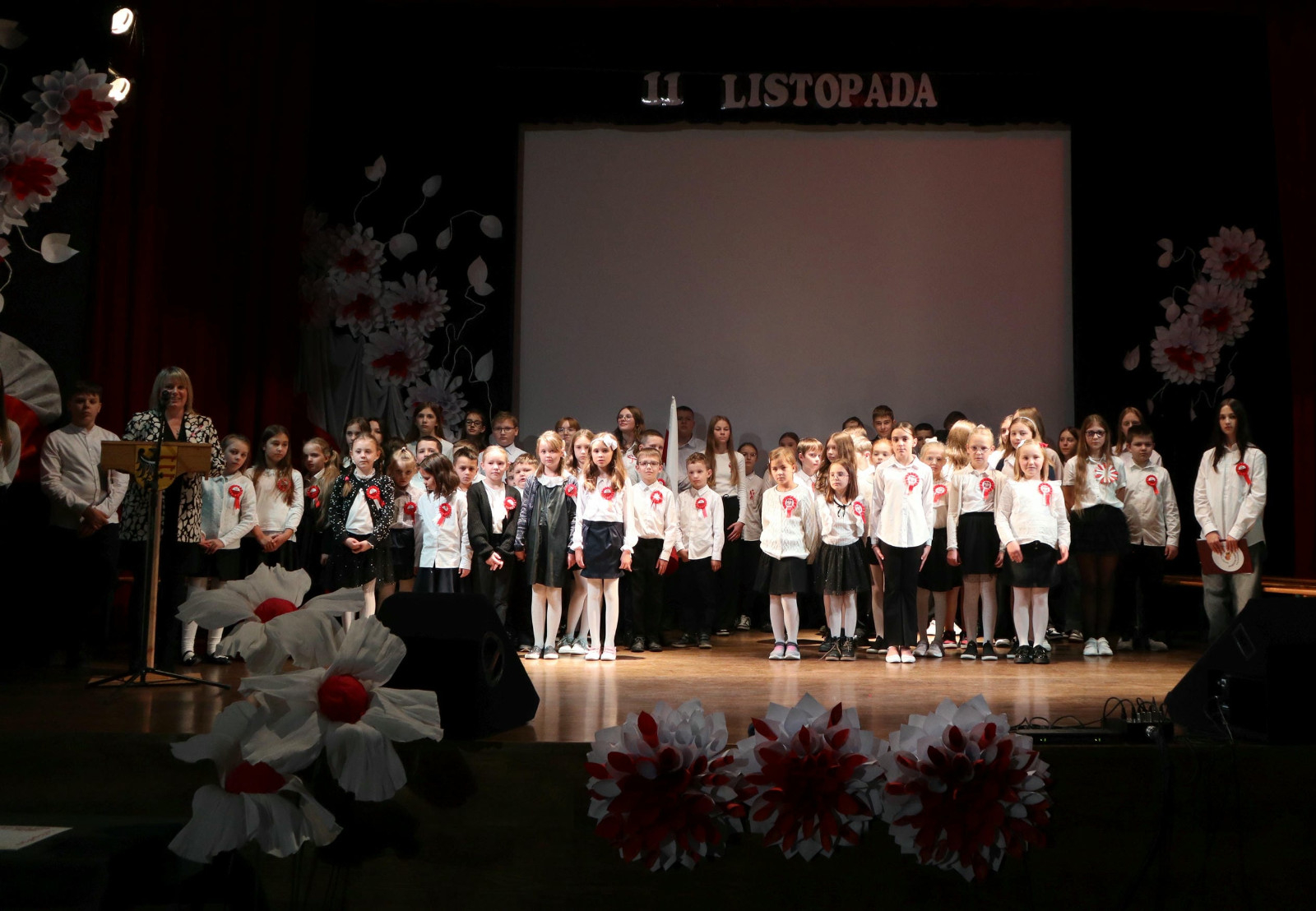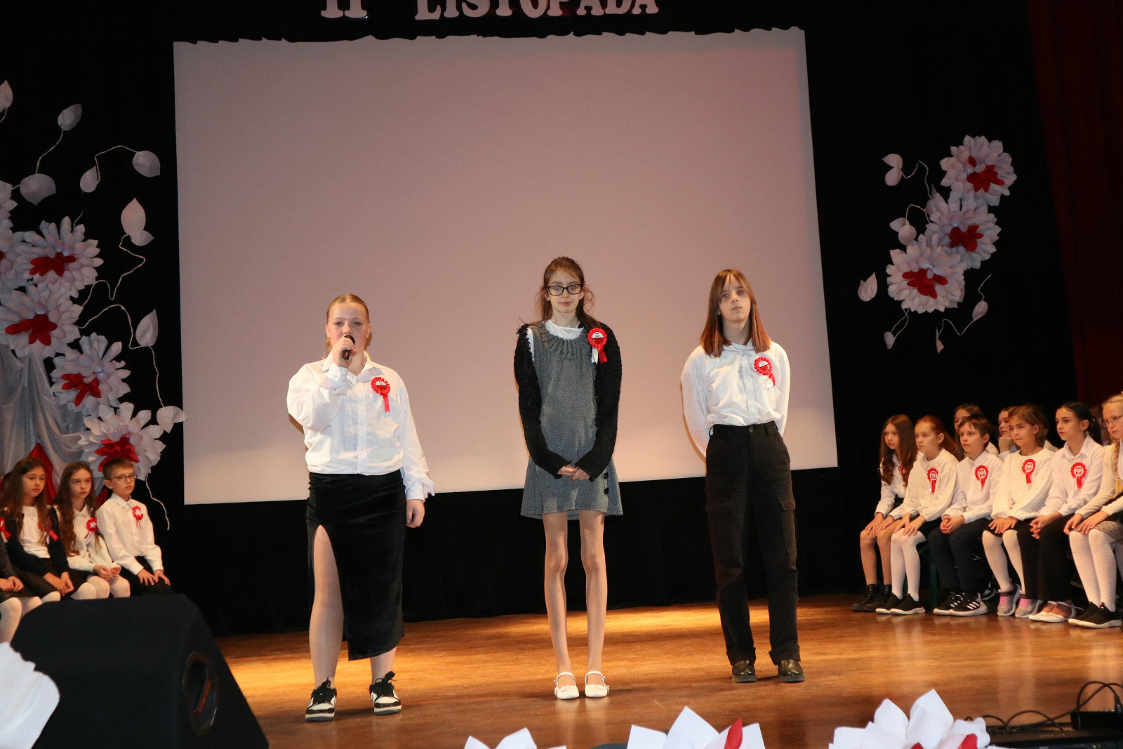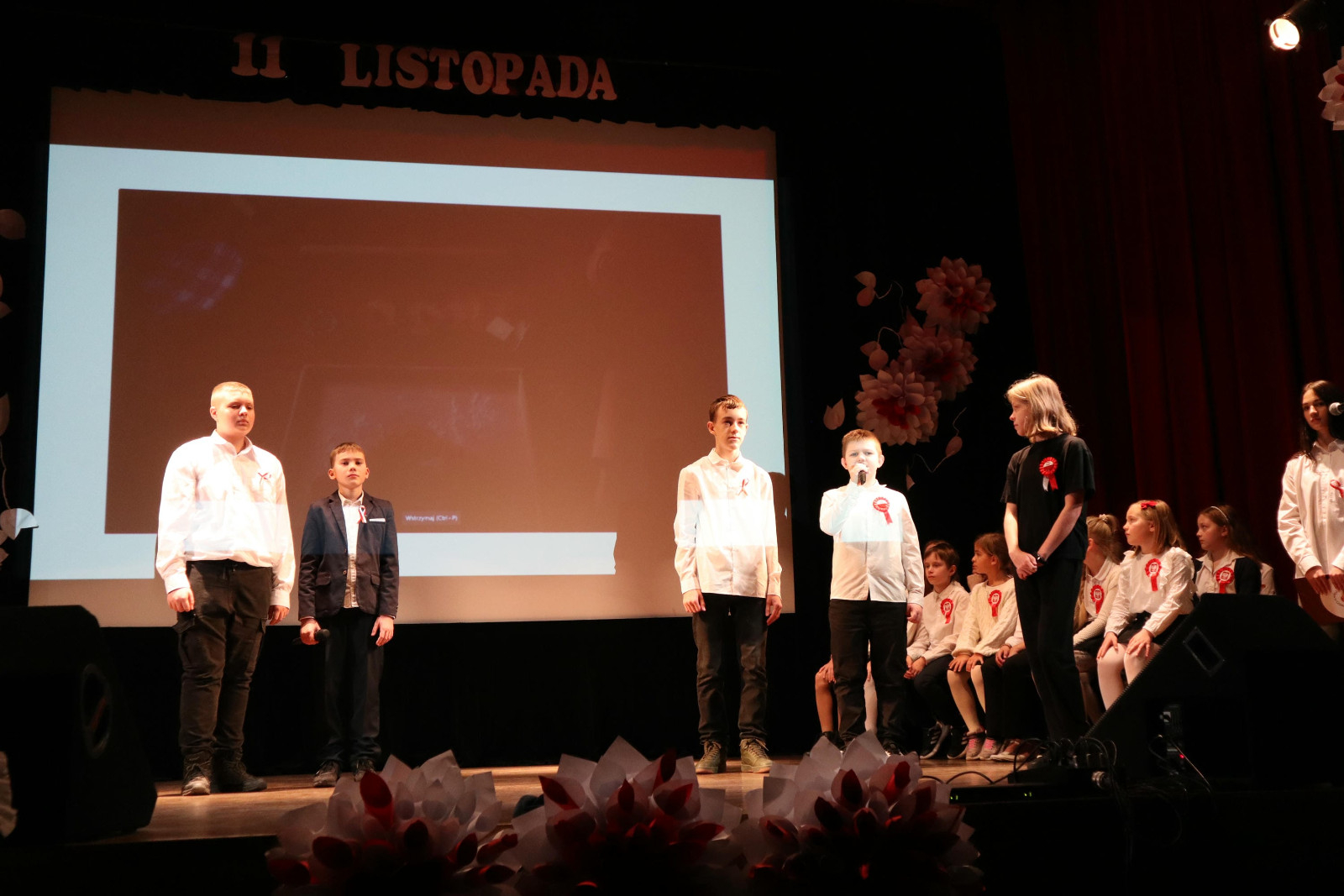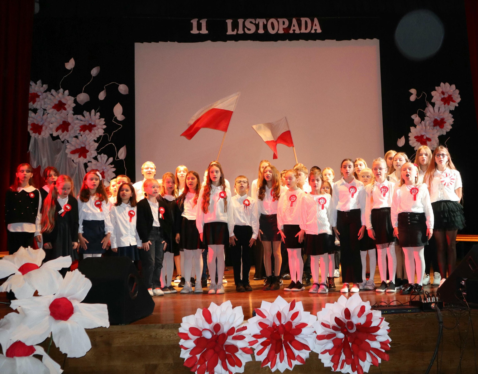 Po wysłuchaniu przemówienia Pani dyrektor Danuty Zaręby, która podkreślała, jak ważne jest to, aby pamiętać historię naszego kraju, rozpoczęła się część artystyczna. Uczniowie z klas 6a, 7a i 7b z wychowawcami: Panią Anną Najdek-Bydłosz, Panią Leną Łuczyńska i Panią Katarzyną Węgrzyn przygotowali montaż słowno – muzyczny „To jest Polska!”. Oprócz wzruszających wierszy, można było usłyszeć pieśni w wykonaniu chóru szkolnego (kl.4-7) oraz uczniów kl. 2a i 3s, których opiekunami są Pani Edyta Chrząszcz i Pan Mirosław Musiał. Na zakończenie, przy łopocie flag, została odśpiewana niezwykle wzruszająca piosenka „Myślimy o Polsce”, której słowa: