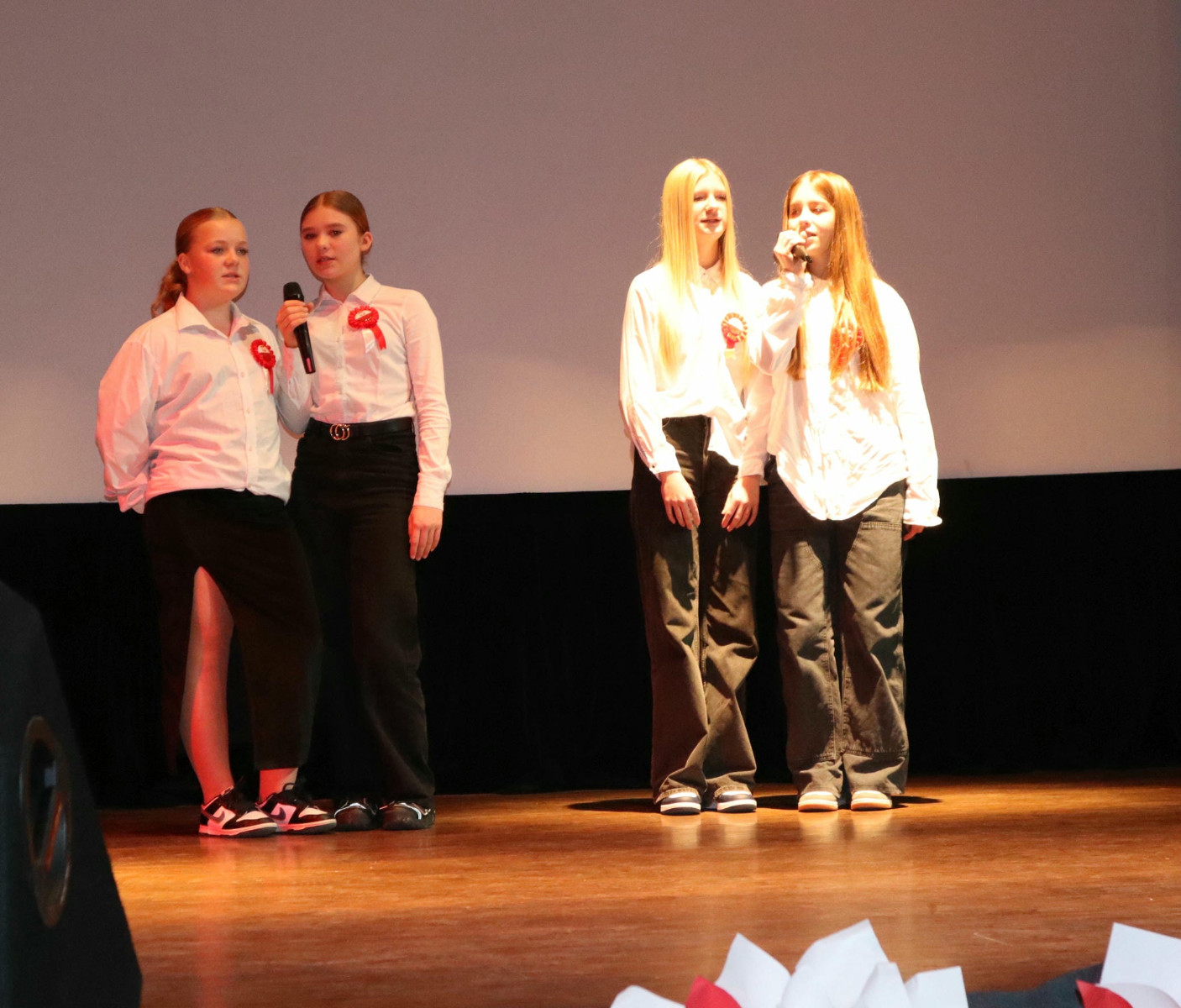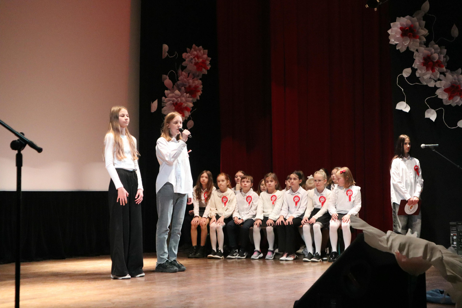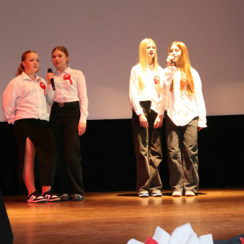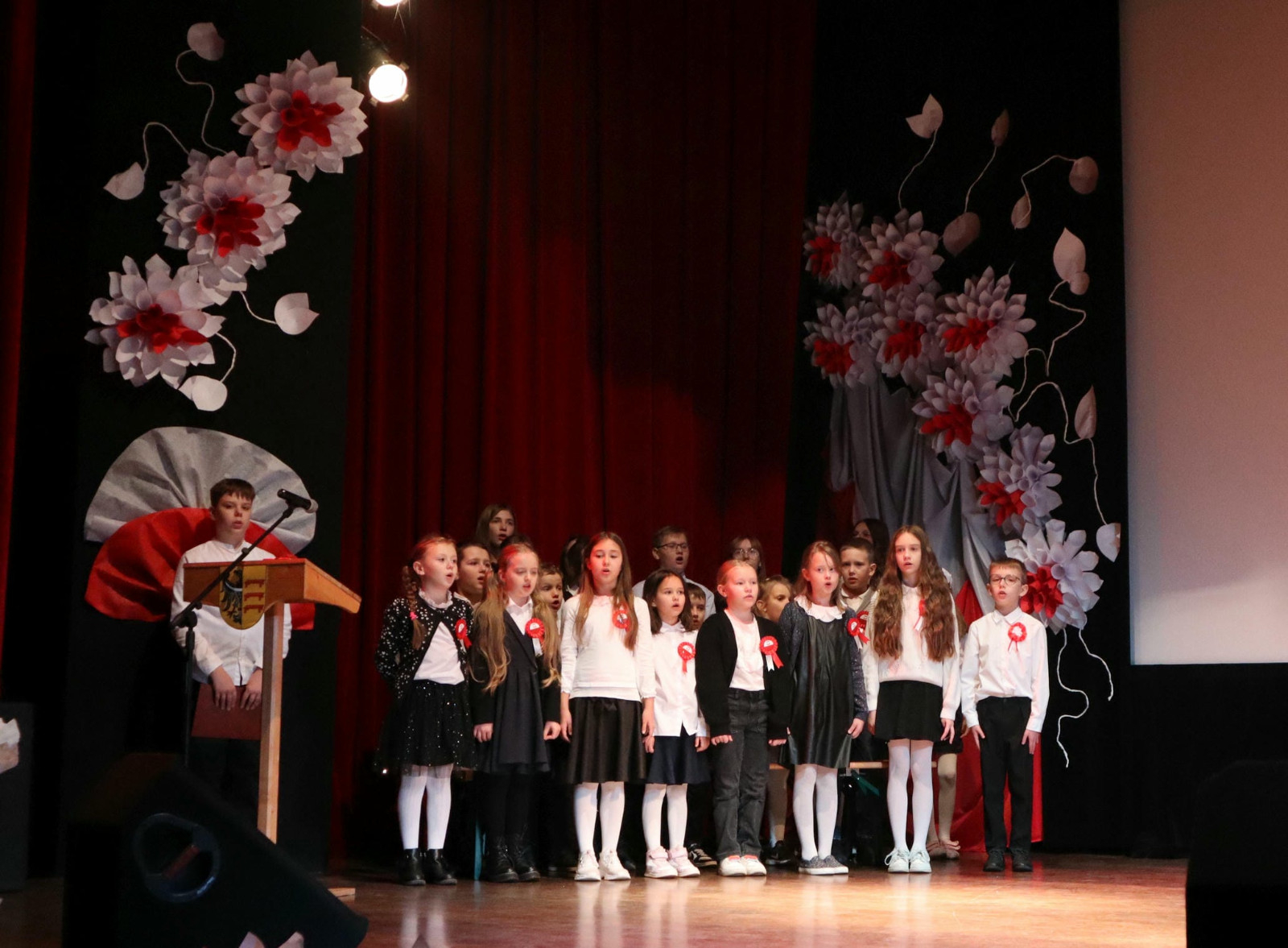 Po wysłuchaniu przemówienia Pani dyrektor Danuty Zaręby, która podkreślała, jak ważne jest to, aby pamiętać historię naszego kraju, rozpoczęła się część artystyczna. Uczniowie z klas 6a, 7a i 7b z wychowawcami: Panią Anną Najdek-Bydłosz, Panią Leną Łuczyńska i Panią Katarzyną Węgrzyn przygotowali montaż słowno – muzyczny „To jest Polska!”. Oprócz wzruszających wierszy, można było usłyszeć pieśni w wykonaniu chóru szkolnego (kl.4-7) oraz uczniów kl. 2a i 3s, których opiekunami są Pani Edyta Chrząszcz i Pan Mirosław Musiał. Na zakończenie, przy łopocie flag, została odśpiewana niezwykle wzruszająca piosenka „Myślimy o Polsce”, której słowa:
